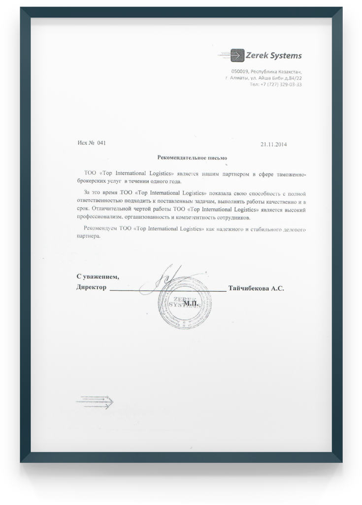 Біздің еншілес компаниямыздың көмегімен "TOP International Logistics" ЖШС, біз жүктерді кедендік тазартудан өткіземіз, ең жақсы шешімін таңдаймыз, барлық қажетті сертификаттар мен рұқсат құжаттарын дайындаймыз.